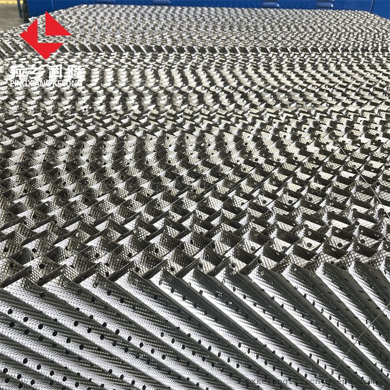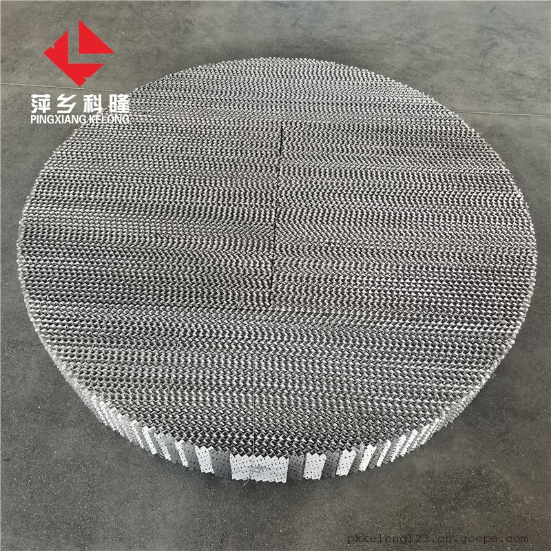 不锈钢孔板波纹规整填料以金属板材为原村料(厚度0.1-0.2mm),在结构上保持了金属丝网波纹填料的波纹片特点,但增大了当量直径使之走向通用化。将冲有小孔的薄金属板带衮(冲)压成带有沟纹的波纹板片。由波纹板片按金属丝网波纹片相同的组装方法,组装成圆盘状填料块。在塔内按均匀几何图形排布,整齐堆砌。它规定了气液流路,改善了沟流和壁流现象,压降可以很小,同时却可以提供更多的比表面积,在同等容积中可以达到更高的传质、传热效果。